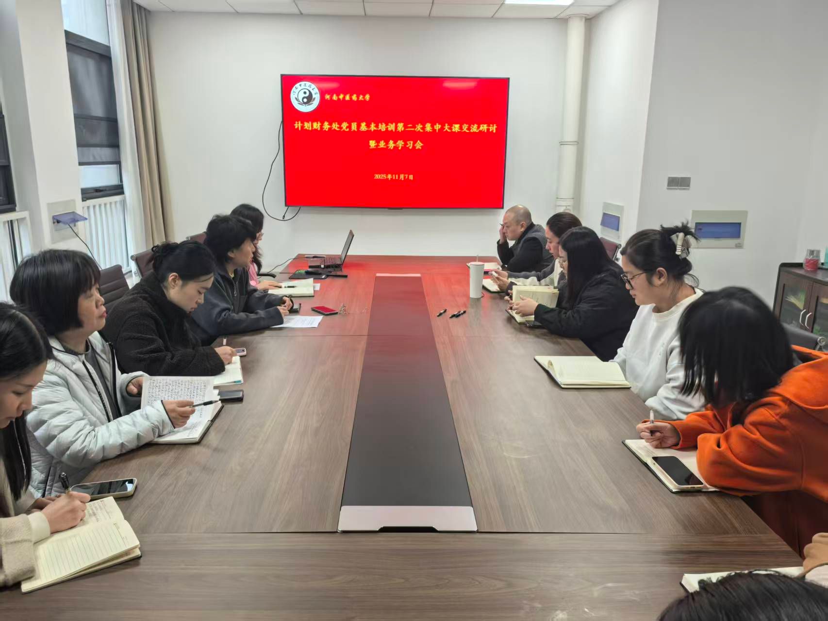 2025年11月7日,河南中医药大学计划财务处在俊学楼B313会议室成功召开党员基本培训第二次集中大课交流研讨会。本次会议旨在深化党员教育培训成效,推动党的创新理论与财务业务工作深度融合,全面提升党员政治素养和履职能力。会议由党支部书记高爽主持,支部全体党员参加。